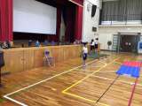 体育館で3年生が体育の授業を行っています。支柱を立ててネットを張る作業を自分た...