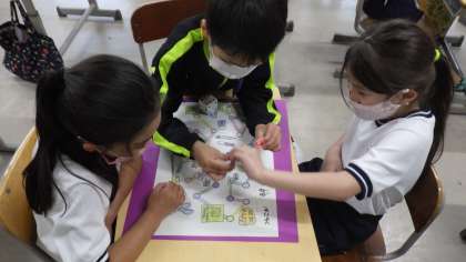 5年生が、総合的な学習の時間に、まわりの人を笑顔にするための工夫を考えて、実行しています。今回は、他の学年が雨の日も教室で楽しめるように、手作りの「すごろく」をプレゼントしてくれました。