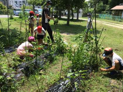 西保見タイムに学級の畑で草取り。 ピーマンがとれました! ナスも早く大きくなってね。