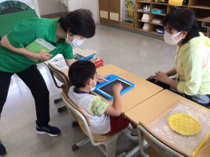 学習用タブレットを使って、平仮名や計算の練習をしました。文字や式を声に出して読むなど、話す練習もがんばっています。
