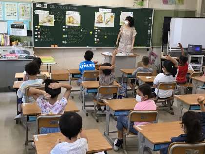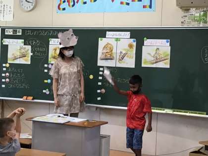 お面をかぶっておおかみさんになりきって、気持ちを考えました。