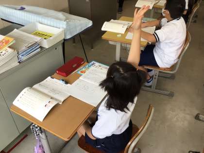 ペアになって話をつなげる学習をしました。手を真っ直ぐ挙げて発言したり、机上がきちんと整頓されていたり、授業に臨む姿勢がすばらしいですね。