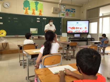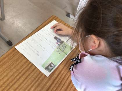 物語「ニャーゴ」を読む学習をしました。役割演技をしたり、電子黒板を活用したりして、言葉の意味を覚えました。なぞり読みでの音読もがんばりました。