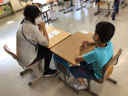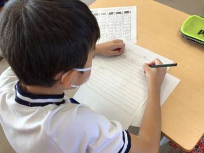 読書アルバム作りに取り組みました。絵本の読み語りを集中して聞き、物語のあらすじを先生に話したり、プリントに書いたりしました。