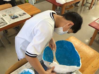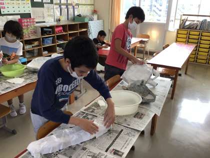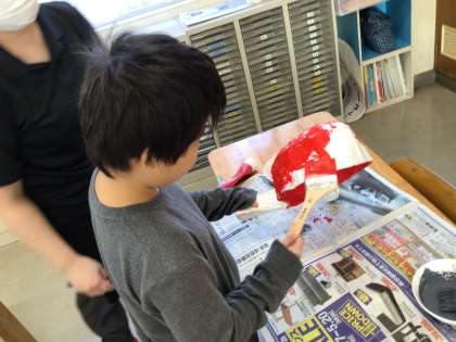 大きなお面作りをしました。自分で好きな色を選び、丁寧に色を塗りました。高学年になると自分たちで相談し、作品作りをどんどん進めていました。