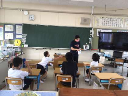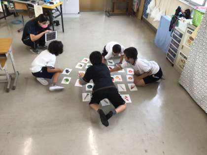 学習用タブレットに映した食べ物の写真と同じカードを見つけるカルタ遊びをしました。楽しみながら、食べ物の名前を覚えていきました。