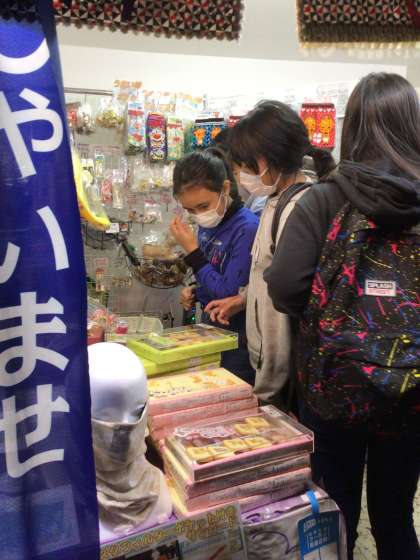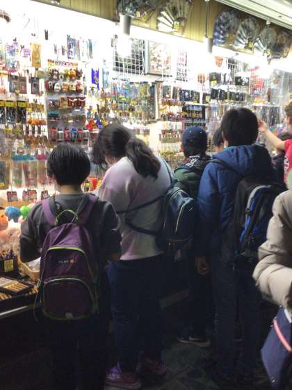 夜店へ買い物に出かけました。美味しそうなお菓子やキーホルダー等、たくさんのお土産を買うことができました。明日の分のお金も考えて買い物を楽しみました!