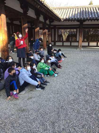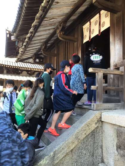 最後の見学地は、世界最古の木造建築物の五重塔がある法隆寺に行きました。