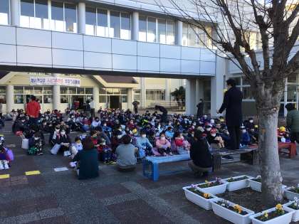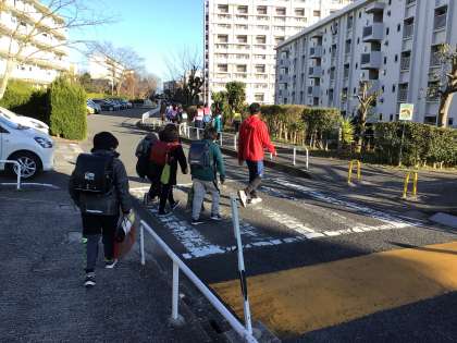 通学班で1列に並んで下校しました。 1月からもみんなで並んで、安全に登下校します。