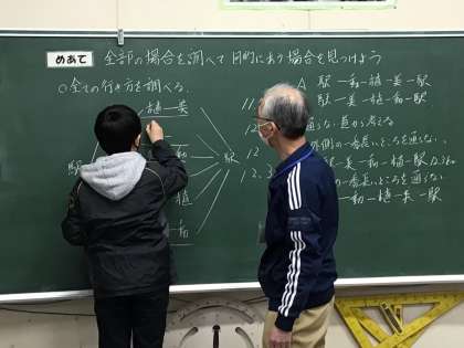 樹形図を使って問題を解く勉強をしました。自分の力で図をかいたり、式を考えて計算したりする姿に6年生らしさを感じました。ノートがとても分かりやすく書かれています。