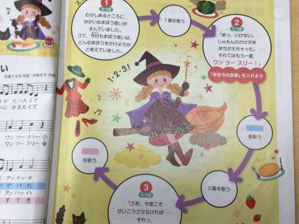 「おかしのすきなまほう使い」の曲に合わせて、魔法の音作りをしました。「ワン、ツー、スリー」の魔法使い役の子の掛け声で、様々な楽器を順番に奏でました。素敵な魔法の音楽が完成しました。