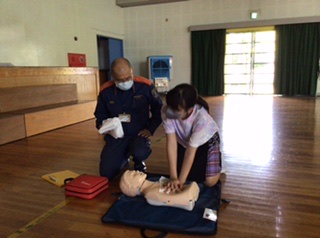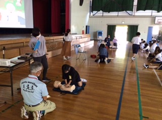 消防署の方を講師に迎えて、けがをした時の対処の方法や、その後の対応の仕方を学びました。心臓マッサージには全員が挑戦。緊張しながらもがんばっていました。