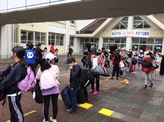 体育館での出発式の後、うきうきしながらバスに乗り込みます。