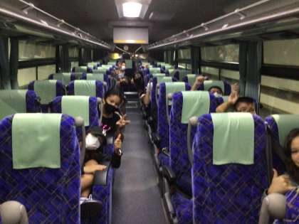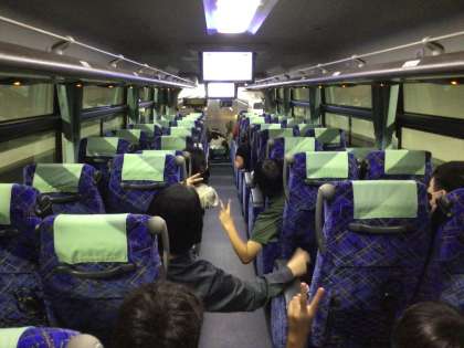 バスの中ではDVDを見ながら楽しんでいます。