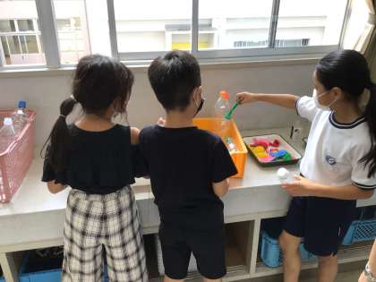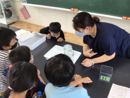 理科室で「かさ」の学習をしました。調べたい入れ物を選んで、その中に何dl入るか予想し、実際に水を入れて確かめました。ぴったり賞をめざして、楽しく学習できました。