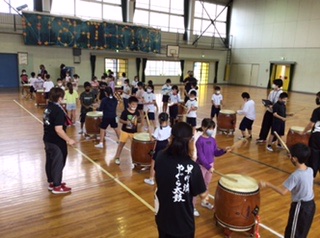 早川流櫓太鼓の皆さんを講師に迎えて、3年生と5年生が和太鼓に挑戦。