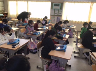 学習用タブレットの発表ノートで、今日はグループ機能を学習しました。ICT支援員さんに教えてもらいながら、グループの友達の写真を見合いました。