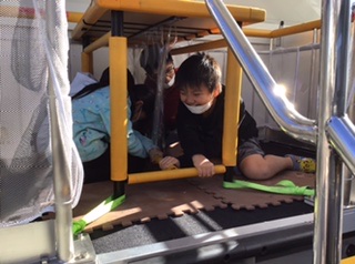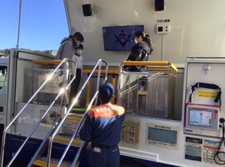 学校公開日の2時間目、地震体験車(防サイくん)で、3年生が震度6の揺れを体験しました。しゃがみ込んで、机の足をしっかり掴んでいても、身体が揺さぶられます。