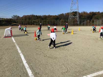 グランパスの方に教えてもらいながら、サッカーを楽しみました。青空の下で、とても楽しくできました。