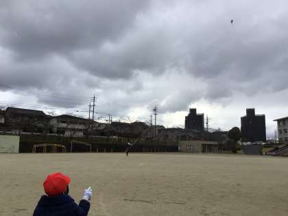 お正月には少し早いですが、午後の強風を活用してたこあげをしました。自作のたこがぐんぐん高く上がっていくことを楽しみながら、力いっぱい糸を引きました。
