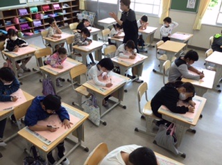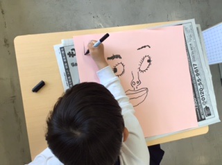 自分の顔を触って確かめながら、クレヨンでゆっくりと描いていきます。