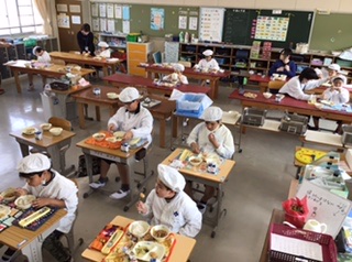 特別支援学級では、白衣を着て食べています。
