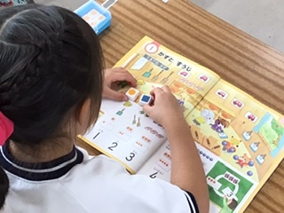 ブロックを教科書の絵の上に置いて、