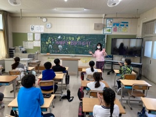 朝、黒板におめでとうメッセージを記入して、先生を迎えました。