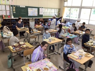 今日の給食はALTの先生と(4年 5月11日)