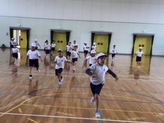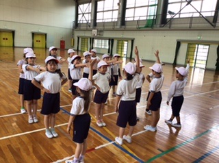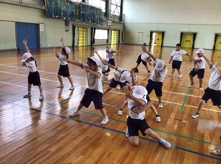 ぴしっと整列した後は、身体を大きく動かして準備体操です。