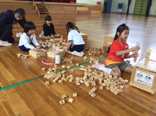 お話の後は、間伐材からできた、いろいろな形の積み木を