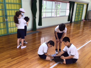 学習用タブレットで撮影しあって、自分の技を確かめています。