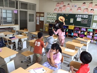 麦わら帽子が飛ばされる場面では、先生が風役として登場です。