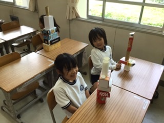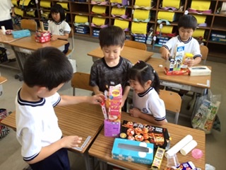 図工の時間、家から持ってきた空箱やラップ芯、卵ケース等を使って