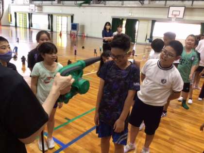 南極では風がとても強いそうです。乗り物に例えると、新幹線の速さくらいの風が吹いているということです。道具を使ってその風を体験しました。
