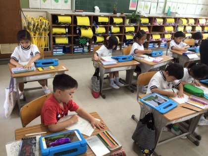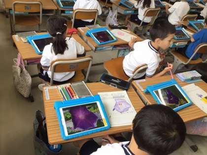 外にあるアサガオの花やつぼみを、学習用タブレットで写真を撮って観察しました。