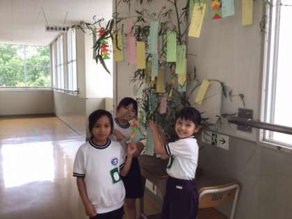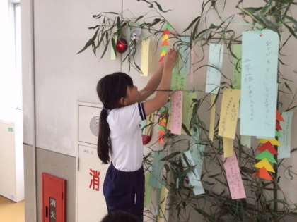 7月7日の七夕に向けて、西保見小学校内にも短冊のついた笹が飾られています。2年生は、それぞれの教室前の廊下に笹が登場です。
