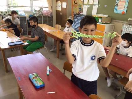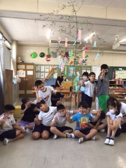 3、4、5組の教室も大きな笹が登場です。みんなで飾り付けをして、記念写真を撮りました。
