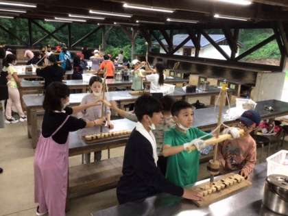 随分涼しくなったファミリーサイト炊事場では、火おこし体験。