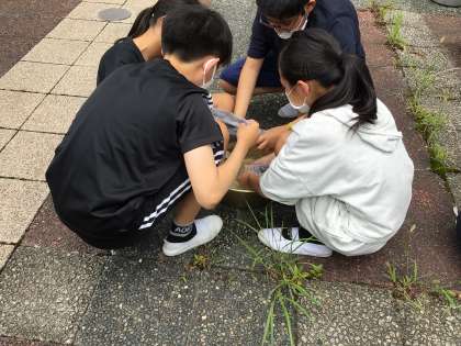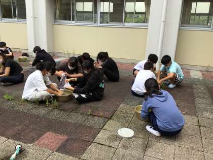 6年生が家庭科で、たらいに水を入れて、自分が使ったぞうきんを手洗いしました。洗剤を使ってもみ洗いをし、汚れがきれいに落ちました。