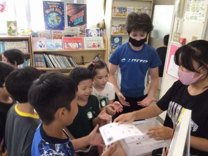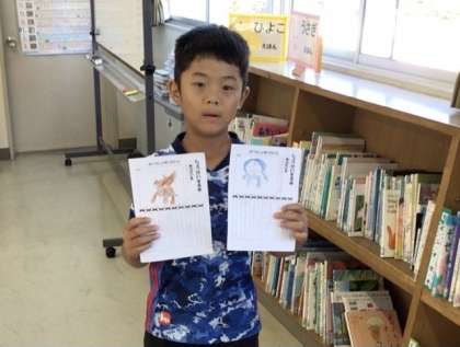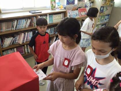 図書委員からはがきをもらって、友達に紹介したい本を書いて図書館のポストに入れます。