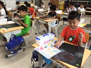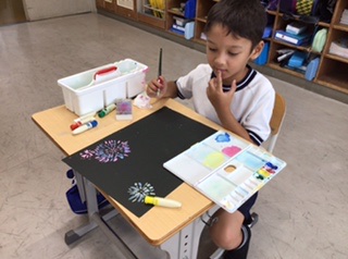 絵の具や色鉛筆を使って、夜空を彩る花火を描きました。