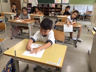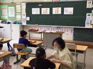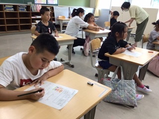 日本語教室では、「かいがら」のお話を読んで、内容をプリントにまとめていました。