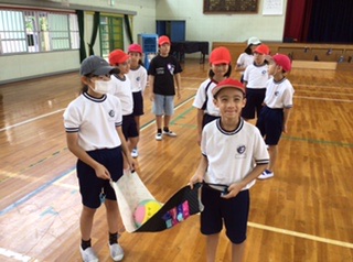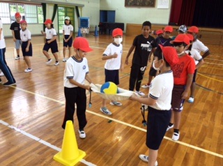 合同体育で、体づくり運動を行いました。今日はボール運び競争。