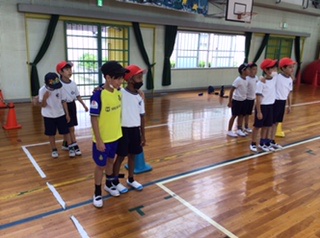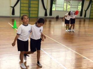 今日は二人三脚に挑戦です。ペアの子と、リズムを合わせて歩きます。