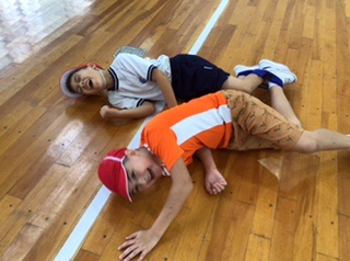 コーンを回ってくるのですが、なかなか難しく、ゴールした後に思わずごろんと床に転がるペアも。
