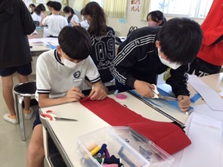 家庭科の授業で、手縫いで箸セット袋を作ります。
