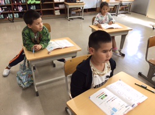 算数の授業です。1年生日本語教室では、長さを使って大きさくらべをしていました。