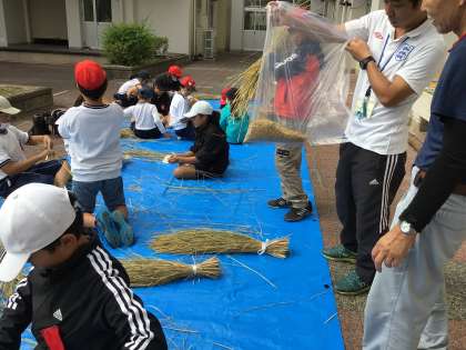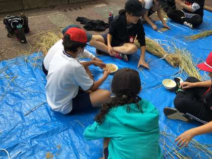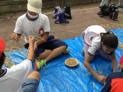 5年1組がみんなで協力して稲の脱穀を行いました。手作業で大変でしたが、丁寧に実をはずして集めました。どれくらいのお米ができるか楽しみですね。