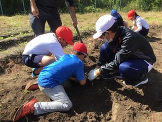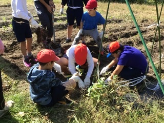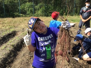 今まで大切に世話をしてきたお芋の収穫をしました。大きなお芋が出てくるのを期待して、一生懸命掘り起こします。